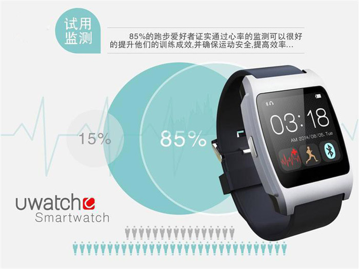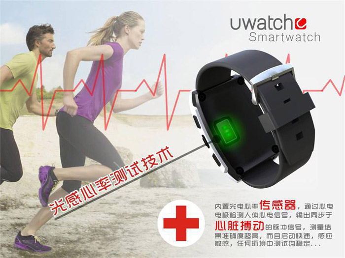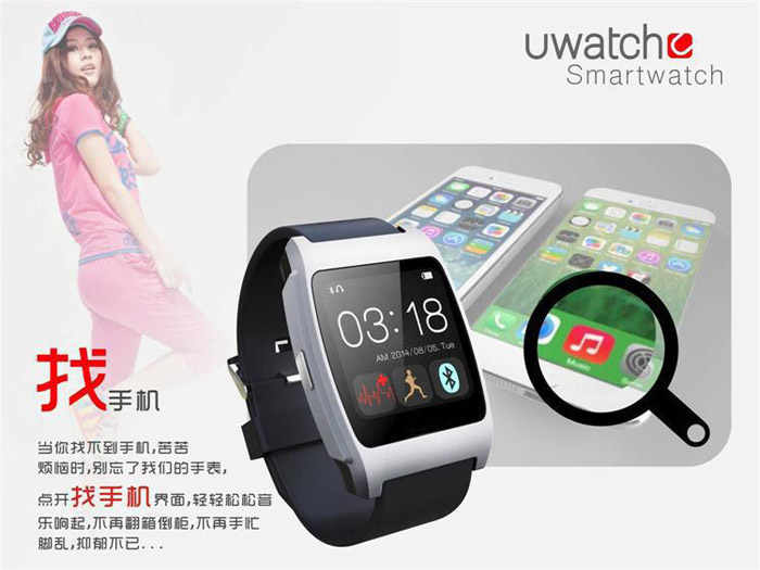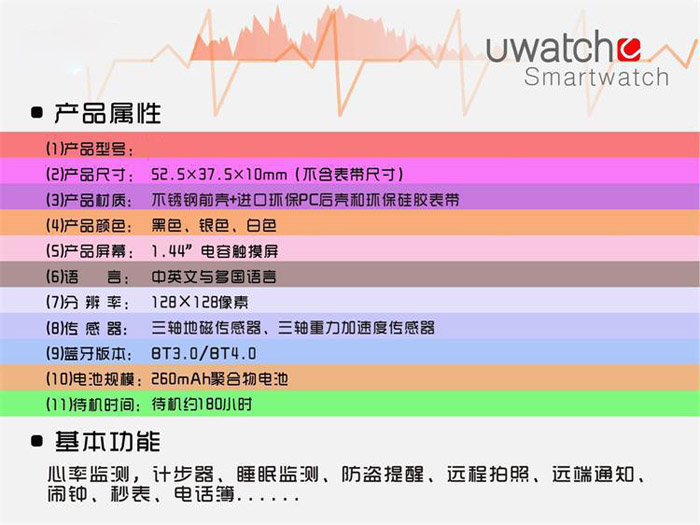 产品功能: 心律监测 计步器 睡眠监测 远端通知 防盗提醒 蓝牙接打电话 远程拍照